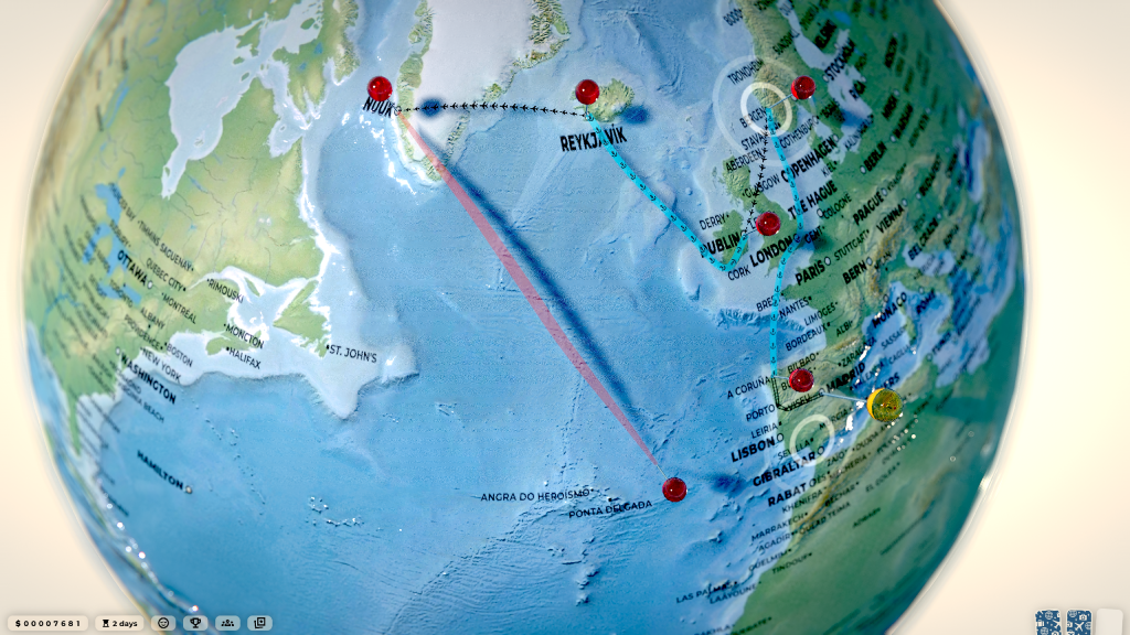This demo features 112 European cities on an interactive 3D globe. Travel by air, boat, bus, or train, each with different costs and routes. Strategic thinking matters: sometimes bus chains beat direct flights, while coastal routes open trading opportunities and boost mood. Your fact-checking work is trivia spanning History, Geography, Culture, Architecture, Food, Nature, Arts, and Sports. Correct answers earn money and maintain mood; mistakes drain both.