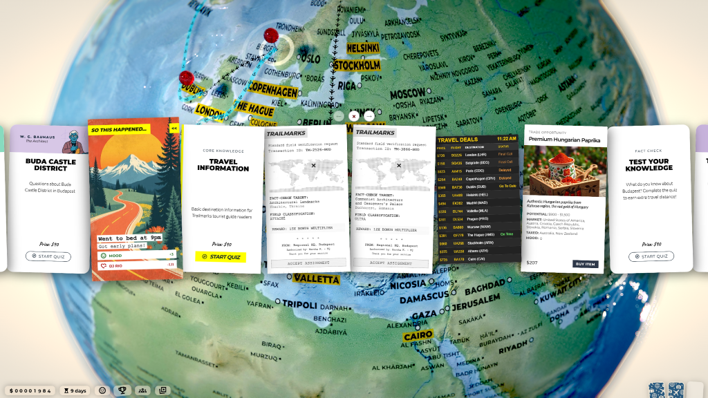 Mood management is critical. When it drops too low, you consult the faulty old Trailmarks guide for a boost, triggering random events: unexpected refunds, stolen phones, compensation claims, disappearing luggage or anything that can happen on the road. To enter restricted nations, demonstrate expertise through quiz performance: master Food and Culture for culinary destinations, Geography and History for remote regions, Arts and Architecture for cultural capitals.