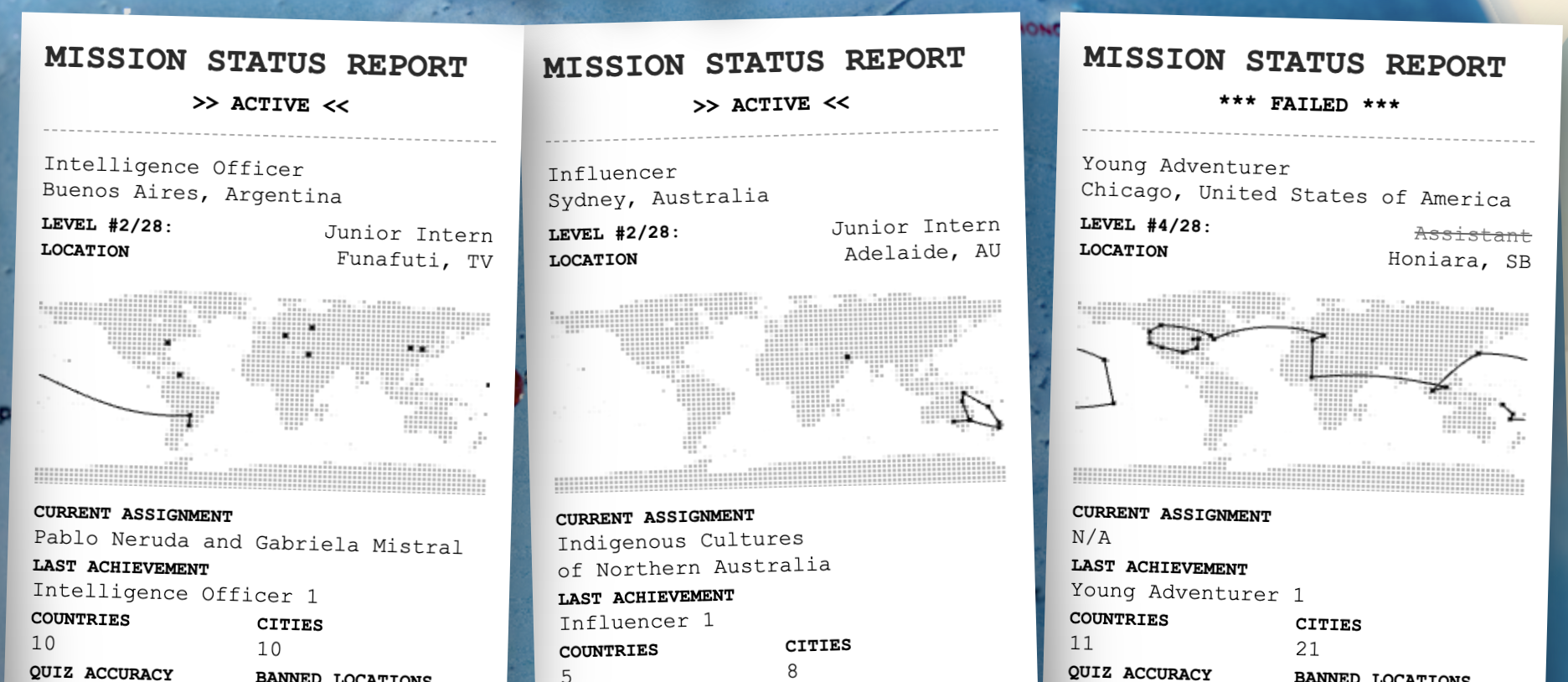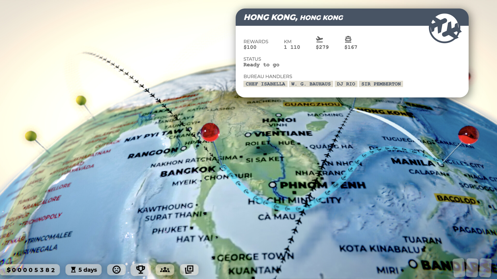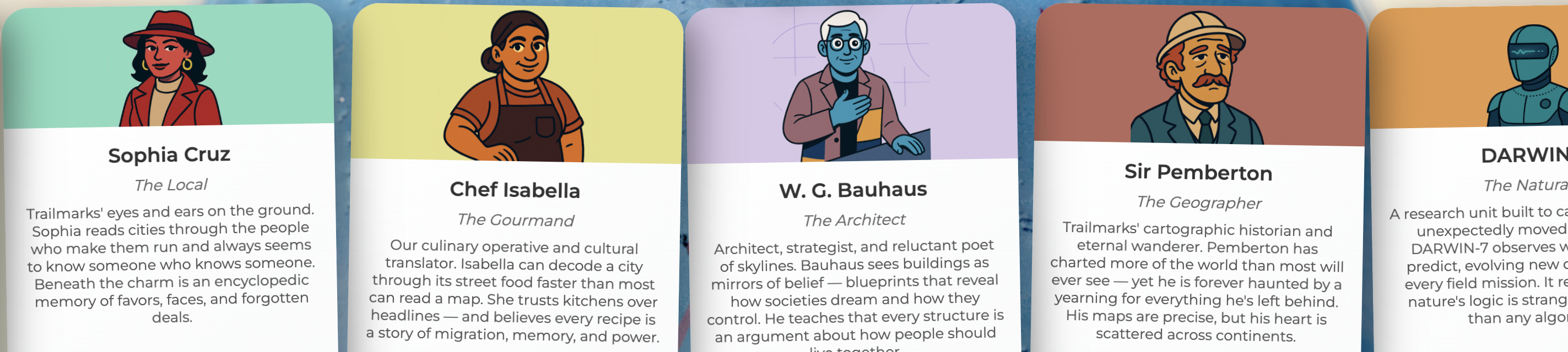 Trailmarks is a globe-spanning strategy adventure about travel, fact verification, and resource management. Travel by land, sea, and air, verify trivia, trade souvenirs, and manage time, money, and morale as you race to complete a full circumnavigation of the world.